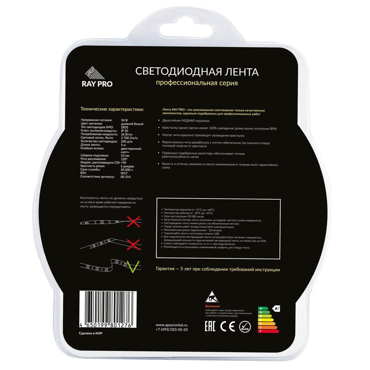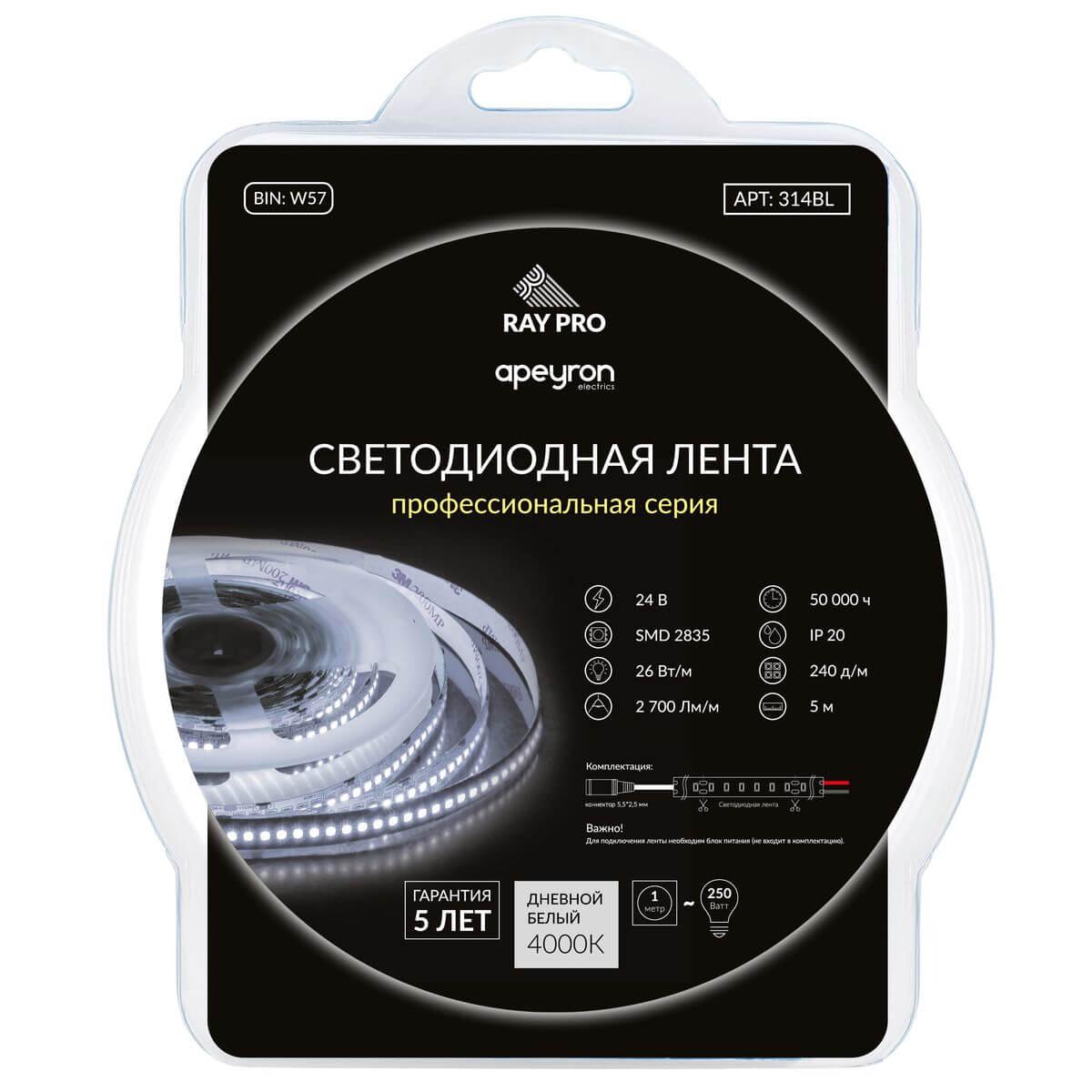 Светодиодная лента Apeyron 26W/m 168Led/m 2835SMD дневной белый 5M 314BL