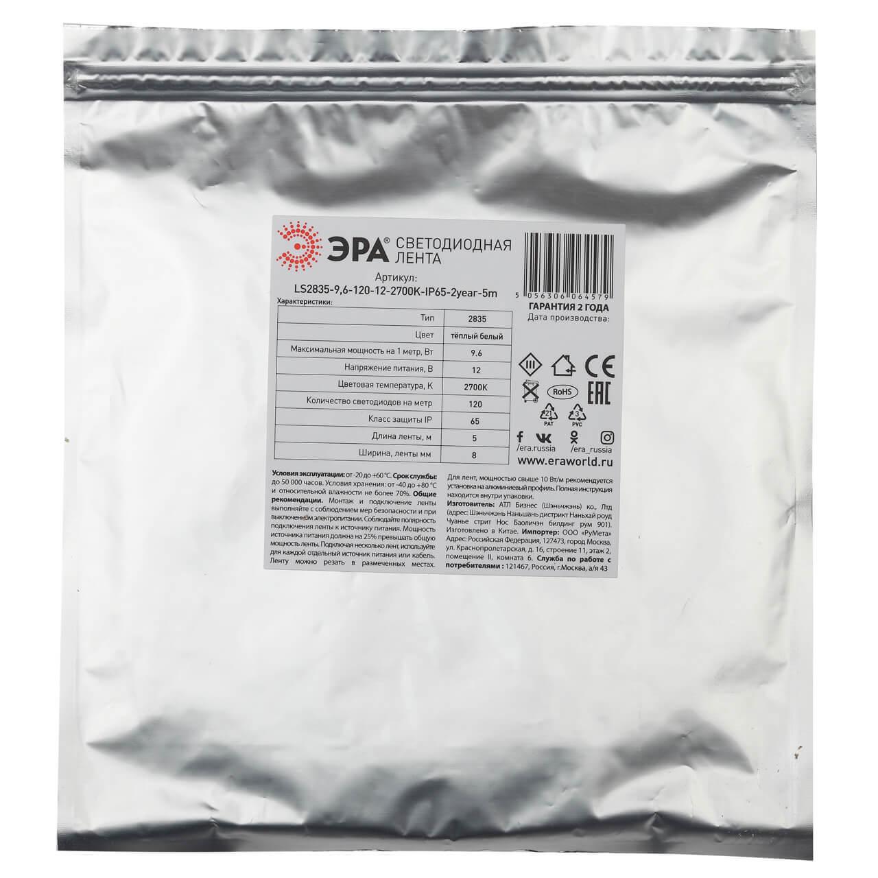Светодиодная влагозащищенная лента ЭРА 4,8W/m 60LED/m 5050SMD 2700K 20M LS2835-4,8-60-220-2700К-IP67-20m Б0043094